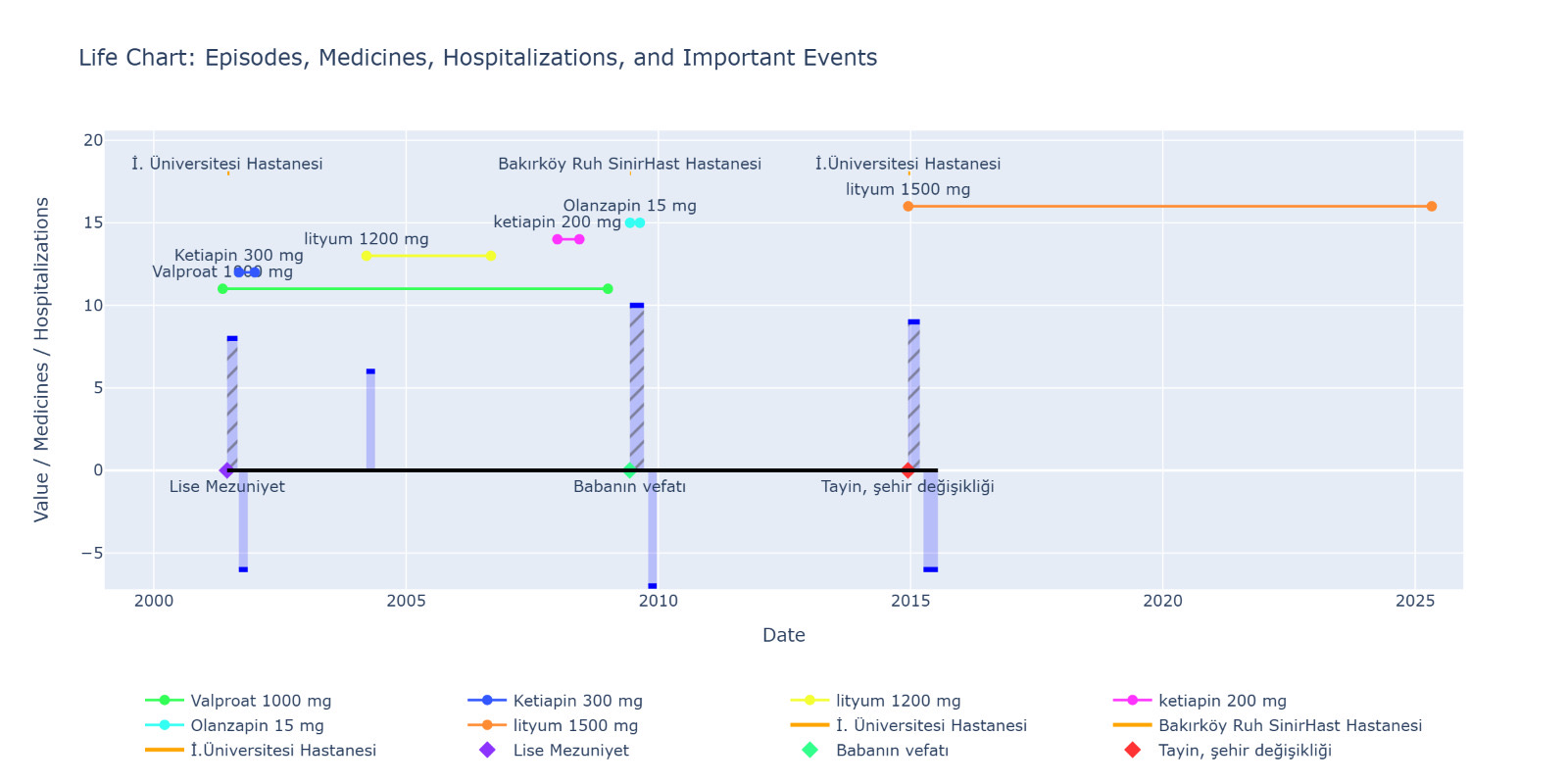 Bu çizelge bipolar bozukluk tanısı olan bireylerin uzun dönem izlemde, hangi tarihte, hangi tipte ve şiddette ataklar yaşadığını, atakların oluşan stresli yaşam olayları ile ilişkisini ve ilaçların etkinliğini görmek için oldukça faydalıdır. Bu çizelgeyi, hastane kayıtları, epikriz, reçeteler, danışan ve ailesinin verdiği bilgilerle geriye dönük doldurup, uzun dönem seyrini de her görüşmede kaydediyoruz. Eskiden elle, cetvelle çizdiğimiz bu görselleri artık dijital ortamda yaratıyoruz.